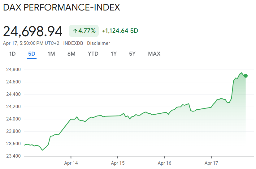 Besonders deutlich fiel die Reaktion an den Aktienmärkten aus. Der Dax sprang regelrecht nach oben und gewann 2,4 Prozent auf 24.734 Punkte. Auch der EuroStoxx50 legte kräftig zu und schnellte um 1,8 Prozent auf 6.041 Punkte.