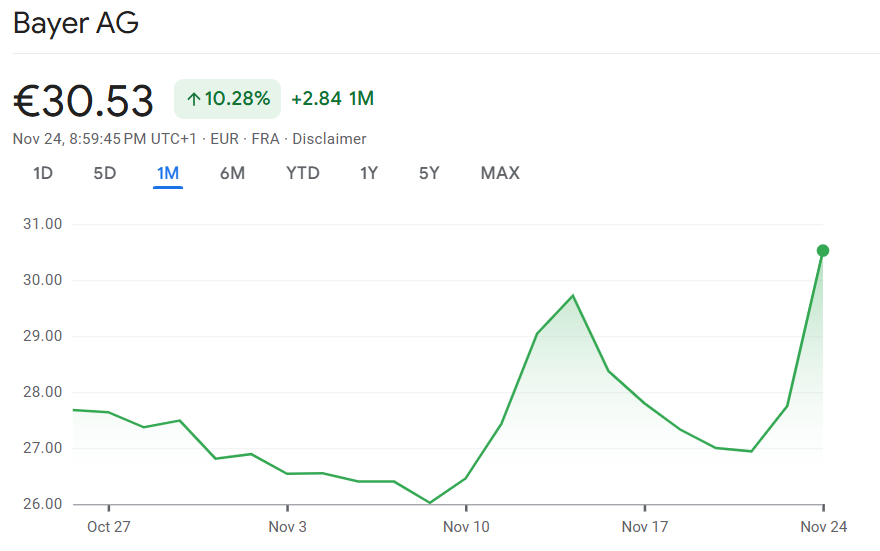 Der Konzern Bayer erlebt an der Börse einen der kräftigsten Tagesanstiege der vergangenen Jahre. Nachdem das Unternehmen am 23. November 2025 positive Ergebnisse zu seinem in Entwicklung befindlichen Gerinnungshemmer Asundexian veröffentlicht hatte, schoss die Aktie zeitweise um 11,2 % nach oben und erreichte mit 30,98 Euro den höchsten Stand seit Januar 2024. Damit war der Wert klarer Spitzenreiter im DAX.