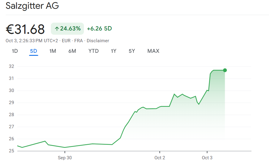 Die Aktien europäischer Stahlhersteller haben am Freitag deutlich zugelegt. Besonders stark fiel der Anstieg bei Salzgitter aus: Der Kurs sprang um 8,6 Prozent nach oben. Damit summiert sich das Wochenplus des niedersächsischen Konzerns auf rund 24 Prozent. Rückenwind gab zudem ein positiver Analystenkommentar, der die Aktie zusätzlich beflügelte.