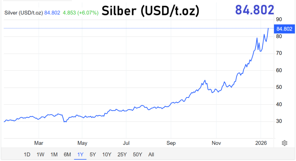 Nicht nur Gold steht im Fokus der Anleger. Auch Silber erlebt derzeit eine außergewöhnlich starke Nachfrage. Der Preis für eine Feinunze stieg um 5,4 Prozent auf 83,26 US-Dollar. Zuvor hatte Silber mit 84,58 US-Dollar ebenfalls einen neuen Rekordwert markiert.