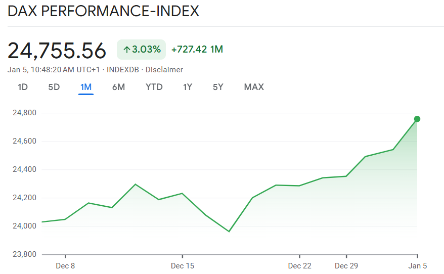 Eine kräftige Aufwärtsbewegung bei Rüstungs- und Technologietiteln hat die europäischen Börsen zu Beginn der neuen Handelswoche deutlich nach oben getragen. Der DAX erreichte im Tagesverlauf ein neues Allzeithoch bei 24.792 Punkten und notierte zuletzt mit einem Plus von rund 1 Prozent bei 24.780 Zählern. Auch der Euro Stoxx 50 zeigte sich fest und gewann 0,9 Prozent auf 5.904 Punkte.