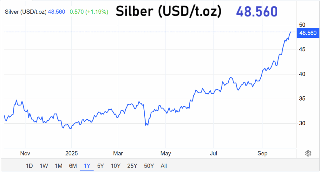 Analysten sprechen von einem „anhaltenden Angebotsdefizit“, das die Preise weiter antreiben dürfte. Der Markt reagiert sensibel auf Engpässe bei Fördermengen und steigende Nachfrage aus Asien. Fachleute erwarten, dass der Preis in Kürze die Marke von 50 US-Dollar je Unze erreichen könnte – ein Niveau, das zuletzt vor über einem Jahrzehnt denkbar war.
