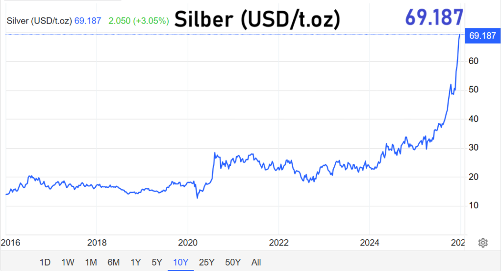 Auch Silber zog zum Wochenauftakt kräftig an und setzte die über Monate andauernde Hausse fort. Mit einem Anstieg von 2,3 Prozent erreichte die Feinunze 68,71 US-Dollar – ebenfalls ein historischer Rekordwert. Damit rückt die symbolträchtige 70-Dollar-Marke in unmittelbare Nähe.