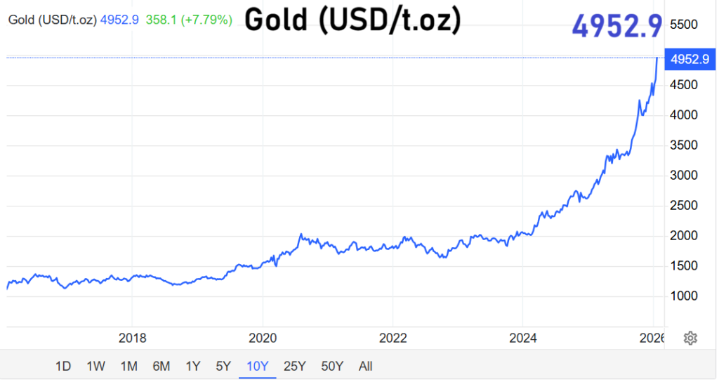 Auch wenn kurzfristige Gewinnmitnahmen jederzeit möglich sind, bleibt die grundlegende Nachfrage nach Edelmetallen hoch. Solange geopolitische Spannungen, wirtschaftliche Risiken und Zweifel an der Stabilität großer Finanzsysteme bestehen, dürften Gold, Silber und Platin weiterhin im Fokus der Anleger stehen.Die Nähe zur 5.000-Dollar-Marke bei Gold und zur 100-Dollar-Schwelle bei Silber verdeutlicht, wie stark die Märkte derzeit von Sicherheitsbedürfnissen geprägt sind.