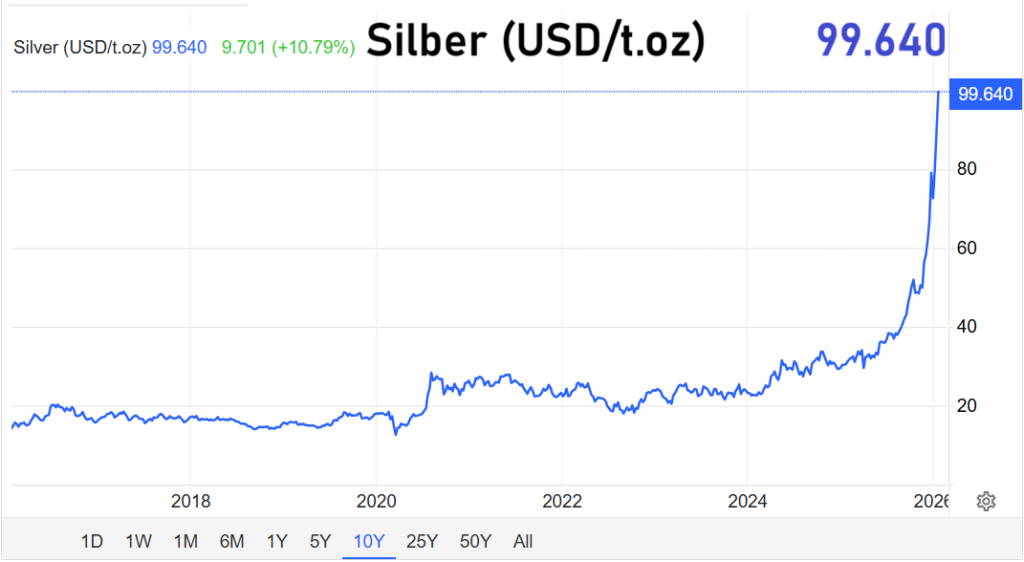 Diese Doppelfunktion spiegelt sich in der Preisentwicklung wider. Im Jahr 2025 stieg der Silberpreis um nahezu 150 Prozent. Seit Jahresbeginn 2026 kamen weitere 38 Prozent hinzu. Die Marke von 100 US-Dollar je Feinunze gilt am Markt inzwischen nicht mehr als unrealistisches Szenario, sondern als kurzfristig erreichbar.