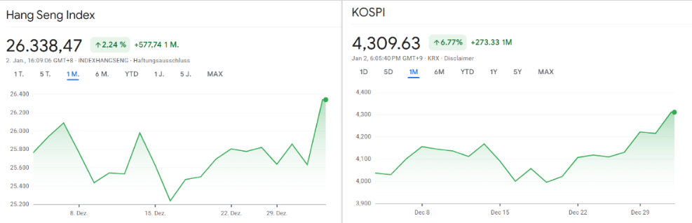 An den asiatischen Märkten herrschte zum Jahresauftakt überwiegend Kauflaune. Besonders deutlich fiel die Bewegung in Hongkong aus. Der Hang Seng Index kletterte zeitweise um bis zu 2,8 Prozent. Treiber der Rally waren vor allem Technologie- und KI-Aktien, deren Teilindizes jeweils um mehr als drei Prozent zulegten.