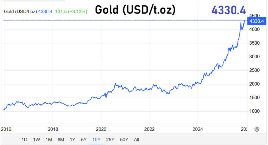 Der Goldmarkt hat am Freitag einen deutlichen Kursaufschwung erlebt. Das Edelmetall legte im Tagesverlauf um bis zu 1,3 Prozent zu und erreichte mit 4338 US-Dollar je Feinunze den höchsten Stand seit sieben Wochen. Händler verweisen vor allem auf die nachlassende Stärke der US-Währung sowie auf neue geldpolitische Signale aus den Vereinigten Staaten.