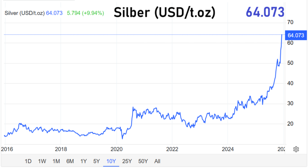 Neben Gold zeigte auch Silber kräftige Zugewinne. Das Metall profitierte sowohl von der allgemeinen Dollar-Schwäche als auch von einem wachsenden industriellen Bedarf. Analysten sprechen von einem doppelten Rückenwind: einerseits von Gold als Leitpreis im Edelmetallsegment, andererseits vom Einsatz Silber in Elektronik- und Energietechnologien.