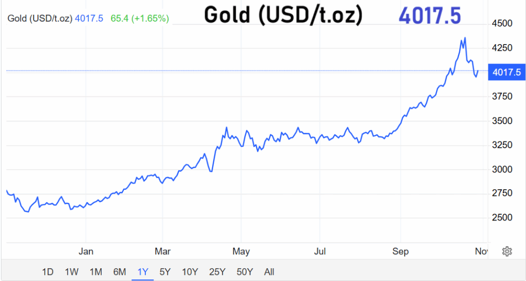Der Goldmarkt zeigt sich vor dem Zinsentscheid der US-Notenbank Federal Reserve in außergewöhnlicher Stärke. Am Mittwochabend kletterte der Preis des Edelmetalls um 2,1 Prozent auf 4.018 US-Dollar je Feinunze und überschritt damit erneut die symbolische Marke von 4.000 US-Dollar. Händler führen den Anstieg auf die Erwartung zurück, dass die Fed ihre Leitzinsen um 25 Basispunkte senken wird. Eine Zinssenkung verringert die Attraktivität zinstragender Anlagen und stärkt dadurch zinslose Werte wie Gold.