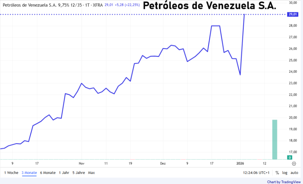 An den internationalen Finanzmärkten hat ein überraschender politischer Einschnitt in Venezuela eine deutliche Kursbewegung ausgelöst. Nach der Festnahme von Präsident Nicolás Maduro durch das US-Militär sprangen die Kurse venezolanischer Staatsanleihen kräftig an. Im frühen europäischen Handel verteuerten sich die Papiere der Republik ebenso wie jene des staatlichen Ölkonzerns PDVSA um bis zu acht Cent je Dollar, was einem Zuwachs von rund 20 Prozent entspricht.
