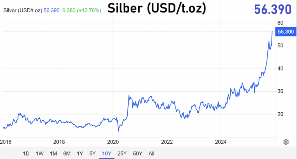 Besonders dynamisch zeigte sich der Silbermarkt. Die Feinunze Silber verteuerte sich auf 55,18 US-Dollar und markierte damit einen neuen Rekordwert. Bereits im frühen Handel hatte der Preis bei etwa 53,50 Dollar gelegen, bevor die Notierungen im Zuge der Marktstörung in Chicago kräftig anzogen. Analysten sprachen von „außergewöhnlichen Bewegungen“, die durch die zeitweise Aussetzung des Terminhandels ausgelöst worden seien.