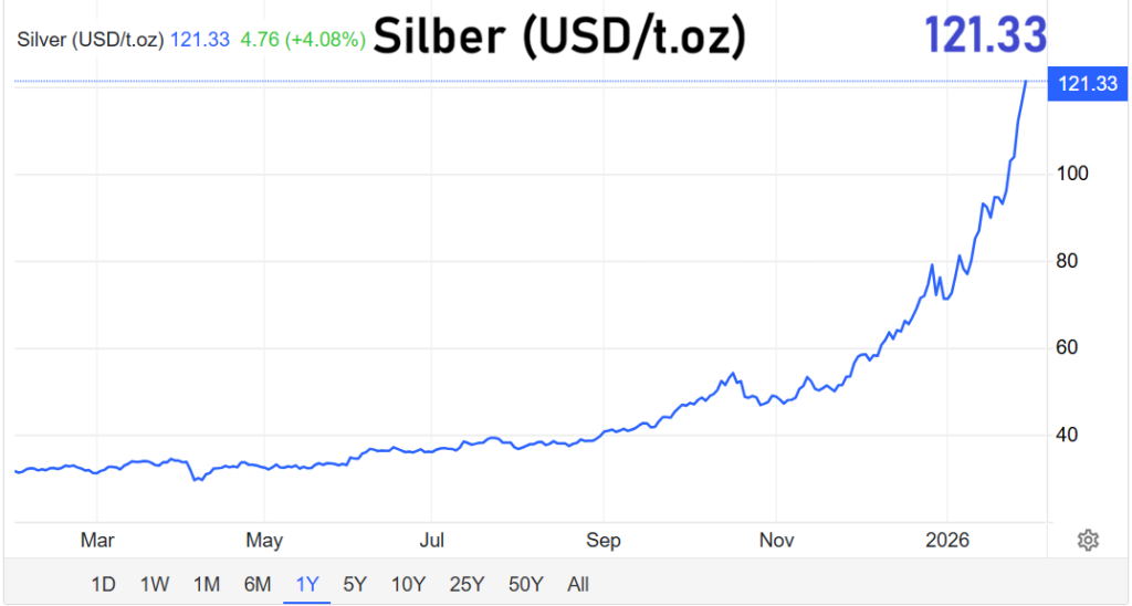 Die Preisentwicklung beider Edelmetalle ist historisch. Gold überschritt zuletzt erstmals die Marke von 5.000 US-Dollar je Feinunze. Silber setzte noch einen drauf: Mit einem Kurs von 117,69 US-Dollar je Unze wurde nicht nur ein neues Rekordhoch erreicht, sondern erstmals auch die psychologisch wichtige Schwelle von 100 US-Dollar überschritten.