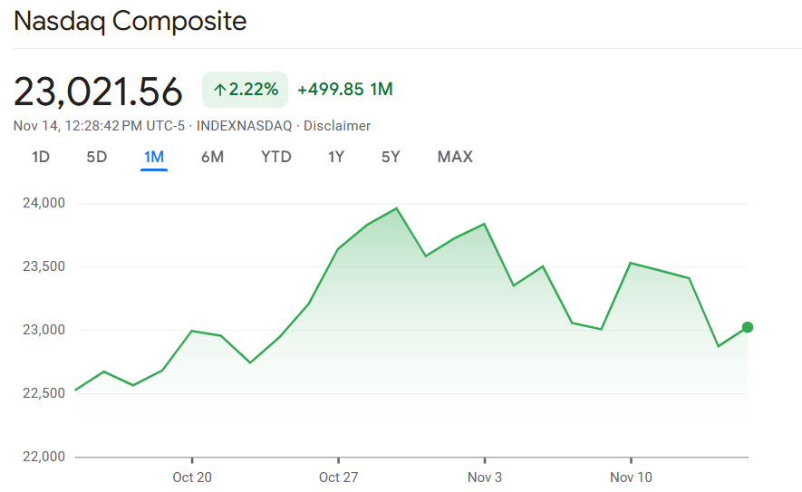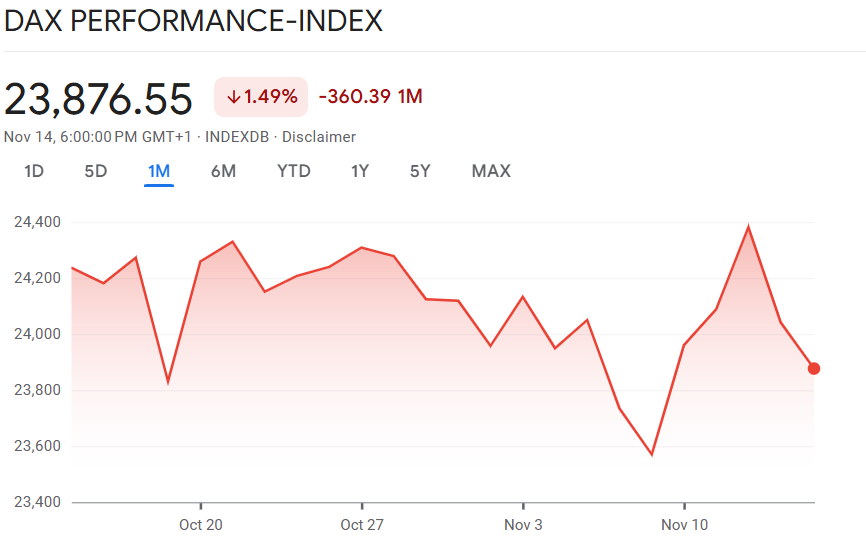 Auslöser der Kursrückgänge waren restriktive Kommentare führender Vertreter der US-Notenbank (Federal Reserve). Diese hatten angedeutet, dass eine Zinssenkung im Dezember keineswegs sicher sei. Die Märkte preisen inzwischen nur noch eine 50-prozentige Wahrscheinlichkeit für eine Zinssenkung um 25 Basispunkte zum Jahresende ein – nach rund 70 Prozent noch in der Vorwoche.